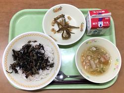 ★2月24日(火) 麦ごはん 牛乳 ひじきごはんの具 魚と豆のから揚げ 体をあたためるしょうがスープ