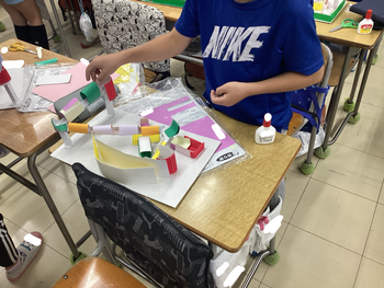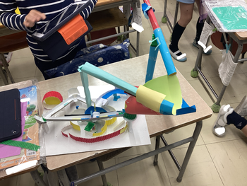 10月の図工の学習で、ビー玉を転がすおもちゃを作りました。ビー玉がスムーズに転がり落ちるようにコースを組み立てたり、ルートが分かれるように工夫したりしていました。