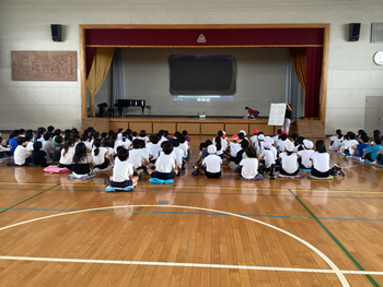9月9日に、体育館に集まって、学年全体でハピスポについての話をしました。