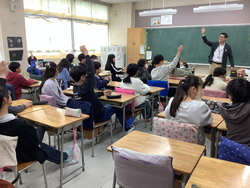 小学校に来て、中学校の先生が授業をしてくれるのもその一つです。今年は、英語と社会の授業体験を行いました。英語はコミュニケーションの練習。たくさんの会話や発声をして楽しんでいました。社会は、為替の仕組みについてゲームを通して歓声や悲鳴をあげながら学びました。
