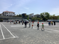 前日の放課後に、交差点や横断歩道など道路の線を先生たちで引きました。当日は、警察の方と交通安全協会の方が来られて、校庭に自動車を入れて疑似体験を行いました。保護者のボランティアの方も来ていただき、子どもが安全に行動できるように、体験での声掛けをしていただきました。