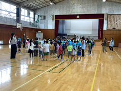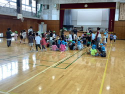 今回は、実行委員が中心になって会の司会や準備を行いました。「もうじゅうがりに行こうよ」をアレンジした「かつらだいしょうへ行こうよ」をしました。何度も違うメンバーや人数でグループを作り、その都度、同じグループになったメンバーで、手遊びや握手を行い仲良く関わりました。