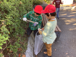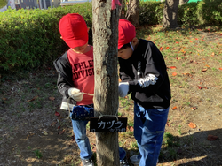 湘南桂台自治会と、みどりの会、土木事務所が行っている取組に、毎年1年生が参加しています。桂山公園の木々に樹名板を取り付け、公園内の清掃を行います。