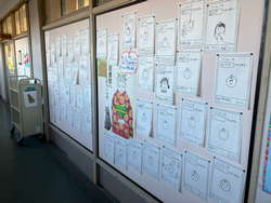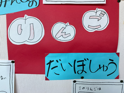 今、図書室前の廊下に、子ども、先生が考えたりんごが掲示されています。「りんごかもしれない」の本のかつらっこバージョン。