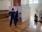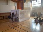 12月18日(木)の3時間目に避難訓練の後に2年生、5年生は横浜市消防局隊員の方に来ていただき、煙体験をしました。煙が上に上がっていく様子を見た後、煙が充満するビニールテントに2年生と5年生はペアになって入って行きました。全く先が見えない煙の中を5年生が2年生の手をとり、リードする姿がありました。火事の際の煙の怖さがわかる体験でした。