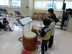 音楽で、たいこのリズムとかけ声で、みんなのオリジナルのおまつりの音楽をつくろうという学習をしました。リズムを考えた後、本物の太鼓を使ってリズムを打ちました。「本物の太鼓だ!!」「初めて叩いたけれど、高い音のものや低い音のものがあるんだ!」「体に響いてくる!」と、みんなとても嬉しそうでした。