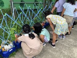 初めてできた小さな緑色のミニトマトがとてもかわいくて、観察カードをかくのも忘れてうっとり眺めている子どもたち。