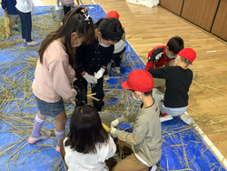 体育館に入るとさっそく!なんか煙たい気が・・・??体育館に入るだけで大興奮の子どもたちでした。