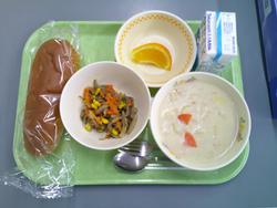 先日、給食委員会が考案したメニュー「ふゆやさいたっぷりシチュー」が本校独自献立として提供されました。