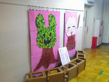 全校児童への呼びかけで集めたペットボトルキャップを使って本校のキャラクターを作成しました。