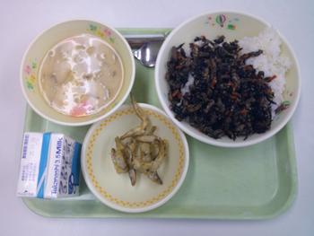 写真は先日のメニューで「麦ごはん、牛乳、ひじきご飯の具、魚のから揚げ、ごじる」です。