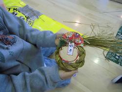 12/17(水)フレンドくんの会、老人会のはっぴークラブの皆様が5年生にしめ縄作りを指導してくれました。子どもたちは今日のしめ縄作りを楽しみにしていて、自分のオリジナルしめ縄にするために様々な飾りつけをもってきていました。しめ縄の縄は、3年生が梨体験でお世話になっている坂田農園さんからいただき、その縄を昨日から水につけておいて柔らかい状態にしてくださったのは学校地域コーディネーターの皆様です。皆様のおかげでスムーズに作成でき、ニコニコ笑顔の5年生でした。できた作品を見せてくれて「新年にふさわしく派手にしてみました!」「なんか、いいことが起こりそうな感じがするでしょ?」等、工夫した点を伝えてくれていました。子どもたちが作品を見せてくれたときの感想で、一言「うまいっ!」と言ったら、「確かに、午年だね!」と答えてくれた5年生でした。