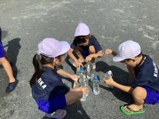 暑さの厳しい中でしたが、「こんな遊びを考えたよ。」「どっちが水を遠くに飛ばせるか競争しよう。」と、子どもたちは、身の回りにある容器を使って水遊びを楽しんでいました。