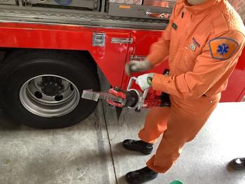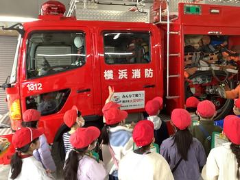 「わぁー本物だ。」「えっ?乗っていいの?」と目の前に停まっている消防車を興味深く見学しました。