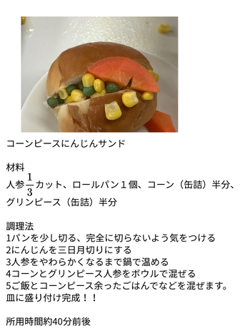 今回紹介する非常食料理名は、(コーンピースにんじんサンド)です。