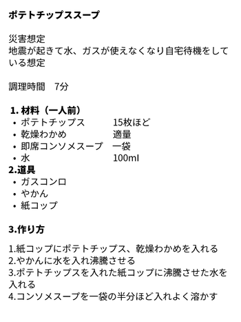 水、電気、ガス不要、料理初心者でも簡単に作れる料理。