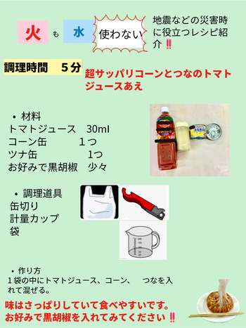 火も電気も使わないし、材料も缶詰系が多いので、災害時にも手軽に作れる!