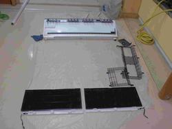 今日のように授業がない日に校舎内のエアコン分解清掃などをしています。今回のエアコン分解清掃では、特別教室等を中心に業者による清掃を行っています。エアコン分解清掃や教室カーテン清掃などは学校配当予算による業者委託で行っていますが、配当予算に限りがあるので、カーテン清掃は毎年実施、エアコン分解清掃は計画的に各教室ブロックごとにローテーションしながら実施しています。