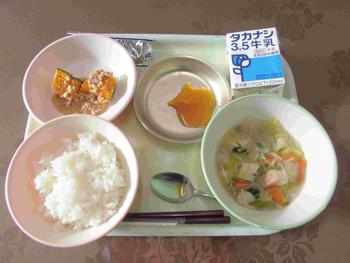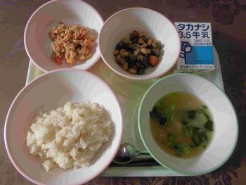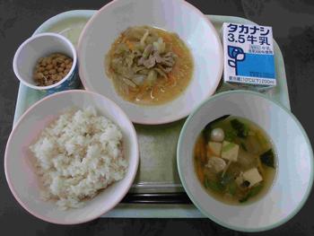 ・はいがごはん ・豚肉と野菜のしょうが炒め ・とうがんのすまし汁 ・納豆 ・牛乳