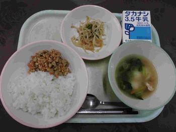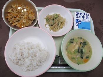 ・はいがごはん ・ツナそぼろ ・じゃがいもの炒め物 ・沢にわん ・牛乳