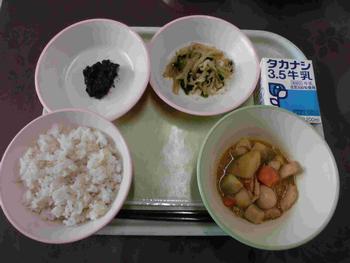 ・麦ごはん ・肉じゃが ・からしじょうゆあえ ・大豆とじゃこの炒りに ・牛乳