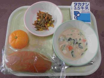 ・黒パン ・ホワイトシチュー ・ごぼうソテー ・みかん ・牛乳