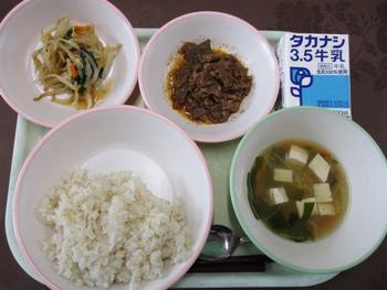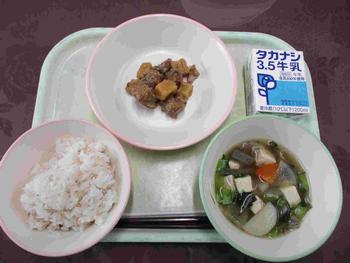 ・麦ごはん ・肉じゃが ・からしじょうゆあえ ・大豆とじゃこの炒り煮 ・牛乳