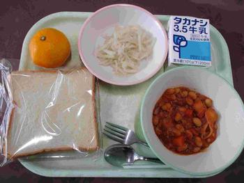 ・食パン ・チリコンカーン ・ジャガイモのソテー ・みかん ・牛乳