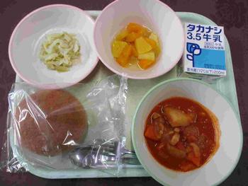・はいがパン ・鶏肉のトマトシチュー ・キャベツサラダ ・ミックスフルーツ ・牛乳