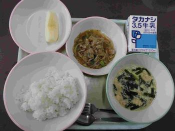 ・はいがごはん ・豚肉と野菜のしょうが炒め ・とうがんのすまし汁 ・納豆 ・牛乳