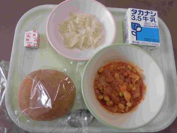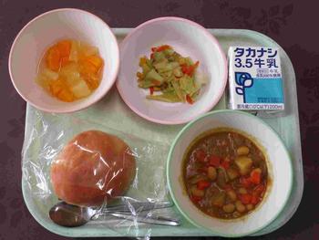 ・丸パン ・カレービーンズシチュー ・野菜ソテー ・ミックスフルーツ ・牛乳