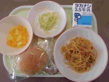 ・ソフトフランスパン ・スパゲティミートソース ・キャベツサラダ ・ミックスフルーツ ・牛乳