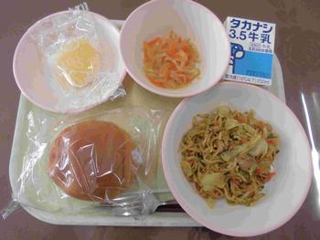 ・ロールパン ・ソース焼きそば ・甘酢和え ・アップルコンポート ・牛乳