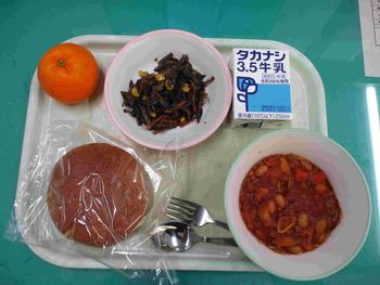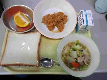 ・食パン ・チリコンカーン ・ジャガイモのソテー ・みかん ・牛乳