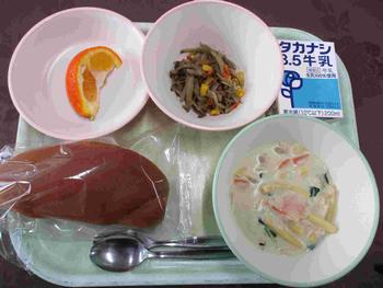 ・黒パン ・ホワイトシチュー ・ごぼうソテー ・みかん ・牛乳