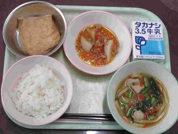 ・ごはん ・生揚げと豚肉のみぞ炒め ・中華スープ ・牛乳