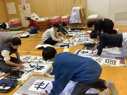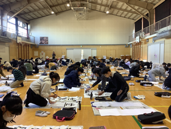 1月8日(木)に書き初め大会を体育館で行いました。「世界の国」と名前を書き終えるまで全員が集中して活動することが出来ました。3つの作品の中でどれを提出するか友達と相談して決める姿も見られました。
