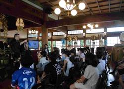 4年生のチャレンジ(総合的な学習の時間)では地域を材に学級ごとに学習しています。今日は妙蓮寺を学習材として取り上げている学級が妙蓮寺に直接行き、本堂で副住職のお話を聞きました。妙蓮寺の歴史的なことを含め丁寧に説明をしていただきました。