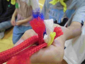 今日の午前中に篠原中学校にて篠中ブロック個別支援学級交流会(篠原中・篠原小・篠原西小・港北小の4校)がありました。前半は体育館にて体操やレク活動、後半は中学校内の見学会でした。写真のひもは、交流会のおりのレクでゲットした他校のひもです。4校の4色のひもを束ねて楽しそうに説明をしてくれました。