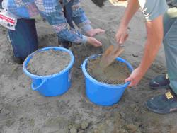 4年生は校庭の砂場で社会科の学習「吉田新田の埋め立て」体験をしていました。「先生この砂のバケツ重いよ!」と当時の人々の思いにふれていました。