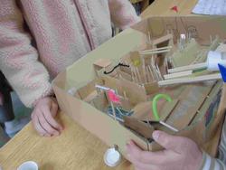 造形ルームでは、4年生が図工で木材を加工した作品作り。制作しているものの説明をしてくれました。
