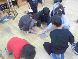 3年生の教室では図工学習。粘土で作品をちょうど作っているところでした。手のひらに絵の具と粘土がついて写真のように微笑ましい姿を見ることができました。