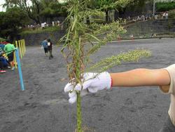 敷地内では技術員が樹木の枝の剪定をしました。子どもたちは地面に落とされた枝を興味深く見ていました。