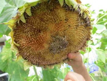 中庭では1年生がひまわりの種を背伸びをしながらとっていました。とてもほほえましい光景でした。