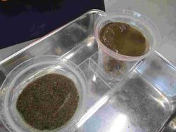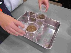 次の写真は4年生が理科室で実験をしている様子です。校庭の水たまりの水を導入にして砂と泥の水のしみこみ方の違いの実験をしていました。