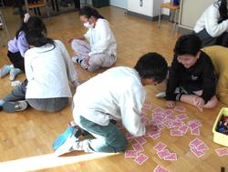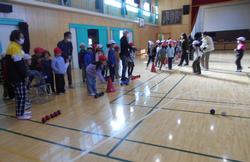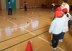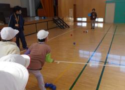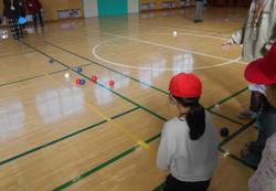 12月4日、1年生と2年生が人権集会の取組で、ボッチャの体験をしました。社会福祉協議会の方を通して、民生委員児童委員の方々に来ていただき、それぞれのグループに分かれてゲームの進行をしていただきました。