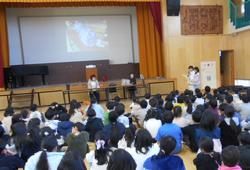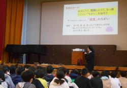 12月9日、5年生と6年生が、人権集会の取組で、ろう特別支援学校の先生に来ていただき、お話をききました。話の中に流れているテーマは、「人は一人ひとりがちがう。その違いを、いったん立ち止まって考えてみよう」ということです。