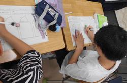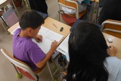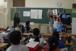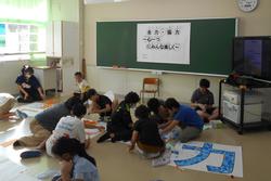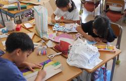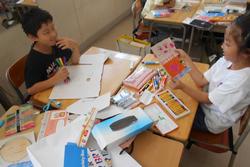 1年生が、いろいろな紙を広げて、図工に取り組んでいました。箱を開いた形を見て、思いついたことを表現したり、描き方やぬり方を工夫して表現したりします。子どもたちは、発想を広げて、熱中して取り組んでいました。