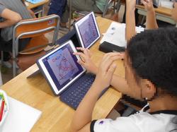 5年生が、算数で図形の角について学習していました。この日は、三角形の3つの角の大きさの輪が180°であることを利用して、四角形の4つの角の和が何度になるのかを調べていました。子どもたちは、四角形の中に三角形を見出すことで説明しようと、複数の考え方を見つけ出していました。