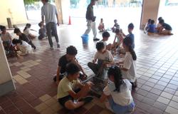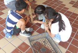 3年生が、ヤゴの産卵床づくりに挑戦しました。トンボには、空中を飛びながら産卵する種類と水辺や水中の植物の茎、葉などに卵を産み付ける種類がいます。毎年、水泳学習の始まる前にプールで3年生によるヤゴとりを行いますが、この「水辺や水中の植物の茎、葉などに卵を産み付ける種類」は、そのままではプールに卵を産みません。そこで、足場となり産卵場所となる床をつくり、プールに浮かべておくことで、いろいろな種類のトンボに産卵してもらう取組です。